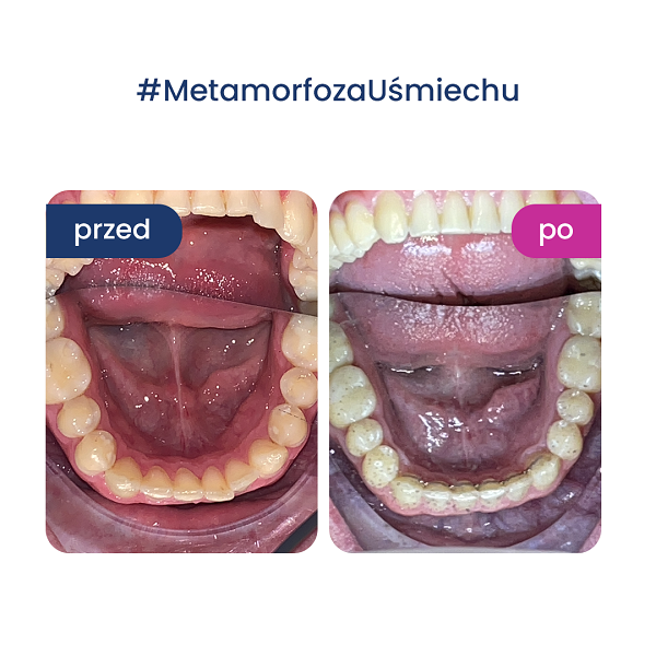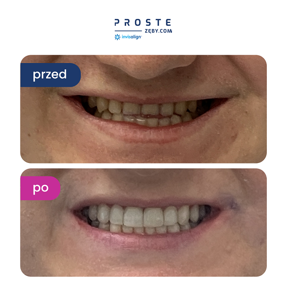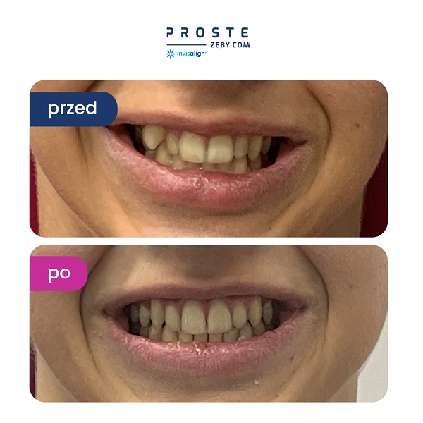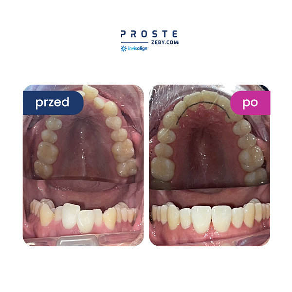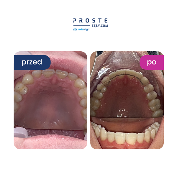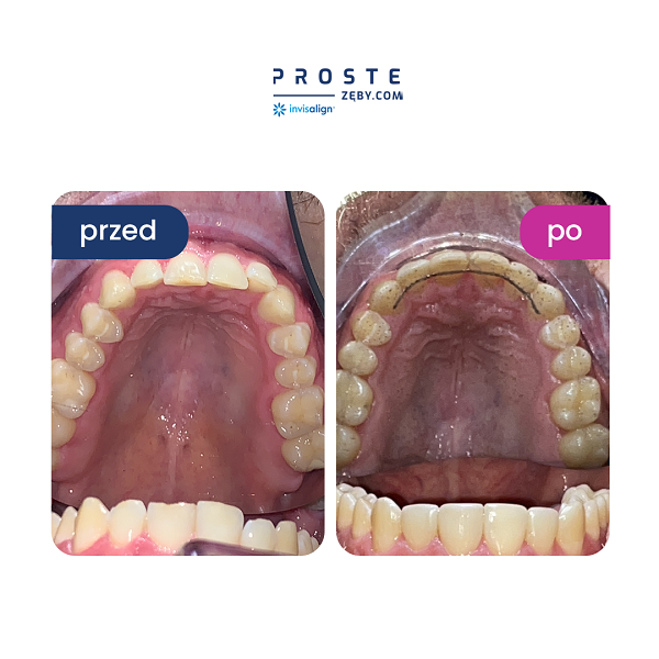 Tomasz zdecydował się na leczenie w Klinice Proste Zęby, ponieważ koszty leczenia Invisalign® na Islandii były 4 razy wyższe niż w Polsce. Leczenie ortodontyczne nakładkami Invisalign® pozwala na rozpoczęcie leczenia w polskiej klinice, pomimo tego, że nie bywa się zbyt często w kraju. W trakcie leczenia wizyty nie są częste, pacjenci sami sobie zmieniają nakładki na kolejne co 7-10 dni. Na etapie planowania leczenia zawsze uwzględniamy w naszej klinice jak często pacjent może być na wizytach w gabinecie i tak planujemy leczenie, aby dostosować się do codziennego życia pacjenta. Stłoczenie zębów u Tomasza było bardzo duże, po pierwszej serii nakładek konieczna była poprawka i pacjent nosił dodatkowe 20 nakładek. Całkowite leczenie wyniosło 54 nakładki, 34 + 20. Leczenie trwało rok i 3 miesiące.