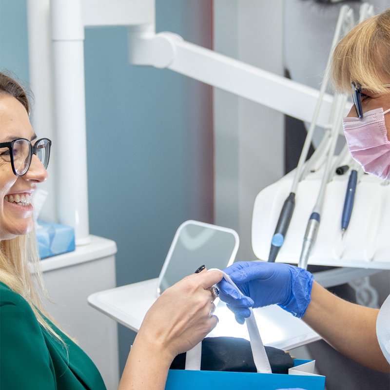 Podczas pierwszej wizyty certyfikowana lekarka Invisalign®, lek. stom. Magdalena Rutkowska, przeprowadza szczegółową konsultację z pacjentem, na którą składa się wywiad oraz badania, które są niezbędne do postawienia trafnej diagnozy.